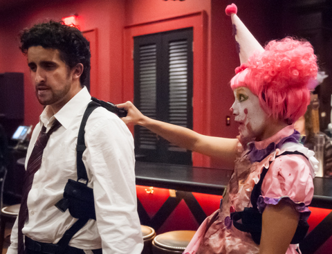 Alex Martinez Wallace_Jessica Lozano Published November 3, 2015 at 480 × 367 in “Clown Bar” sends in, and up, everyone’s favorite punching bag, courtesy The NOLA Project Next → Alex Martinez Wallace (Happy) and Jessica Amber Lozano (Popo). (Photo by John B. Barrois)